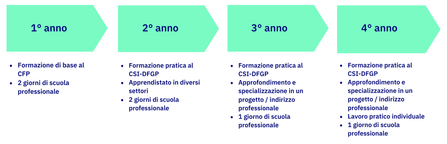 Offriamo una formazione quadriennale ad ampio raggio. Dopo aver completato la formazione di base durante il primo anno presso il centro di formazione professionale CFP, continuerai il tuo percorso nelle varie divisioni del CSI-DFGP. Frequenterai la scuola professionale due giorni alla settimana: il corso ha una struttura modulare e fornisce le basi teoriche per un impiego pratico nell’azienda formatrice o nel CSI-DFGP.